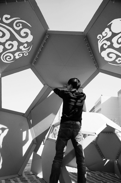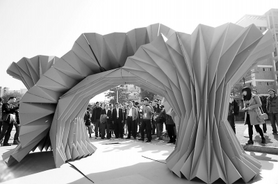 要说当天最抢眼的建筑,当属“莫比鸟斯环”。参与这个建筑作品设计的成员介绍,将一个纸袋的两端扭转180度,再粘接起来,就形成了“莫比鸟斯带”,它就如同被拉长的阿拉伯数字“8”。“一只蚂蚁能不越过棱就可以从纸上的任何一点到达其他任何点!”