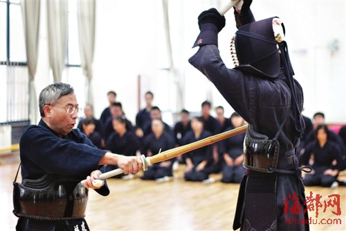 N本报记者 李薇/文 黄启鹏/图 本报讯 “劈要有力道,侧身,然后横切……”14日上午,在福建师范大学武术馆,福建工程学院和福建师大的40名大学生,在一名七段高手的指导下练习剑道。这是一场海峡青年剑道交流大集训,教练邱弘博来自台湾,是台湾“中央大学”剑道协会的“总教头”。昨日,他受聘为“福建工程学院剑道协会指导老师”,今后,将义务指导福州的大学生们练剑。 说起剑道,不少人还很陌生,但福建工程学院的剑道协会已经成立一年了。协会创始人、大四学生沈翔说,自己曾跟来自台湾的剑道六段郑立山老师学习,老师的心愿就是将剑道在两岸发扬光大,举办“海峡杯”两岸青年剑道比赛。然而,去年郑老师不幸因病去世,为了完成老师的遗愿,沈翔在福建工程学院成立了剑道协会。 创立之初,福建工程学院剑道协会只有3个人,而现在已经发展到70个人,还有福州大学的同学加入。 剑道的装备包括靛蓝色的剑道服、头盔、胴甲、胴小手、垂摆和竹刀,“全副武装”后,看起来“高端大气上档次”。“训练完,穿着这身衣服走在学校里,常有同学围观,还有人上来要求合影。”沈翔笑着说。 尽管看上去很帅,但训练却很辛苦,光护具就有近10斤重。沈翔说,有的同学受不了苦,中途退出了,但“留下来的都是精英”。现在,他们每周训练两次,今年10月,沈翔还作为福州队的代表,参加了第一届全国剑道邀请赛,这是由国家体育部门主办的最高等级的剑道专项赛事。 剑道的最高段位是九段,不过,基本没人取得九段资格,八段也非常罕见。邱弘博老师自幼学习剑道,花了30多年时间才升到七段,曾多次受邀担任大陆及台湾剑道比赛裁判。 他说,剑道虽然在日本发扬光大,但却发源于中国,他的愿望就是在两岸大学生中继续推广剑道,把福建工程学院的剑道协会培养成一个“标杆”。