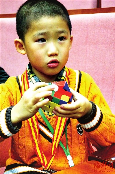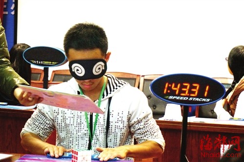 本报讯 一个颜色被打乱的三阶魔方(每面都有9个小正方形),所能形成的组合有4300多万兆亿个之多,而要在10秒左右将其复原,难度可想而知。昨日,由团福州市委等单位主办的首届世界魔方协会福州公开赛在福大新校区举行,来自省内外的100多位“魔友”同台竞技。最终,福建工程学院的张海旭仅仅花了11秒多的时间,就把一个杂乱无章的“三阶魔方”每一面都复原了。更让人“目瞪口呆”的是,现场的选手们不光比试两只手玩魔方的本事,还比试一只手玩、蒙上眼睛玩,来自福大的陈志煌盲拧三阶魔方,103秒就搞定。