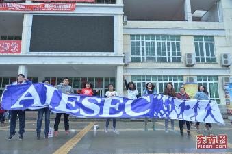 “AIESEC福州”的成员拿着印有“AIESEC”标志的横幅欢呼。