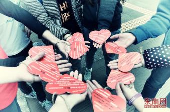AIESEC福州的宣传单全都设计成了爱心的形状,便于回收再利用。据悉,AIESEC福州分享会将于3月8日在福建师范大学举行。