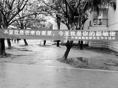 “不管我是否来自星星,今天我是你的都敏俊!”昨日清晨,闽江学院一区宿舍楼下,一条红色横幅成功吸引无数眼球。这条横幅为闽江学院外语系的男生精心定做,结合时下正热的韩剧《来自星星的你》,给本系的女生送上“韩版”祝福。
