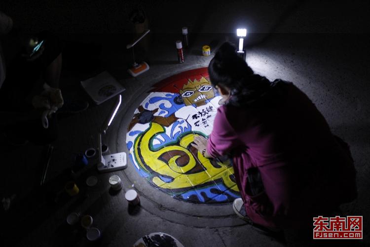 原来,这些彩绘井盖是由18名《肆年》杂志成员(该杂志为福建工程学院学生自办的独立学生杂志),从21号晚5点,到次日凌晨3点,历时10余个小时彩绘而成的。每个井盖的“彩妆”都是他们自己独立设计的,以“肆”为主题,色彩鲜艳,引来路过的同学们一片惊赞。