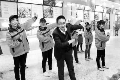 “你是我的小呀小苹果,就像天边最美的云朵,春天又来到了花开满山坡,点燃我生命的火火火火火……”伴随着欢快的乐声,只见那男经理很有节奏地摇摆着身子,还合着音乐节拍,不时领着众阿姨拍掌,走舞步……