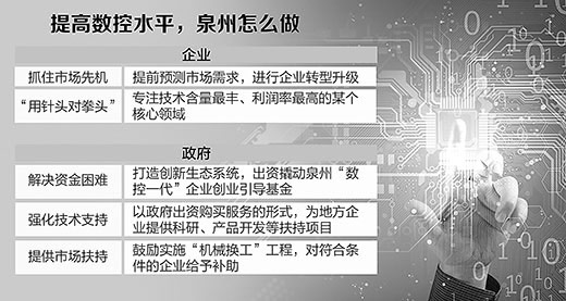 2014年,泉州市成为福建省第一个“数控一代”首批国家级示范工程试点。2014年底,中国工程院院长周济率中国工程院院士、专家调研后表示,要将泉州作为“中国制造2025”地方试点,给予科技支撑计划项目支持。提高数控水平,企业和政府是怎么做的?又能解决什么问题?记者深入泉州,一探究竟。