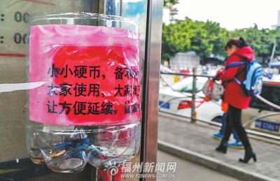 昨日下午,福州晚报记者来到靠近杨桥永辉一侧的杨南路口公交站。公交站牌上用透明胶带绑着一个透明的塑料罐。罐体贴着一张红纸,写着“小小硬币,备不时之需。大家使用,大家填充。让方便延续,让爱心传递。”塑料罐内放置着几枚1角、5角的硬币,合计起来有两元多。这些零钱无人看管,市民可以自取。