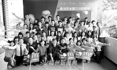 “520招聘周”将持续到5月23日。在这期间,麦当劳敞开大门请大学生体验和参观,关注“麦当劳加入我们”(JoinMcDonald⁃sChina)微信公众平台,就可以预约到店参观!关注福州晚报微信公众平台,回复“游戏”可参加趣味游戏,测试你在麦当劳的职业成就。