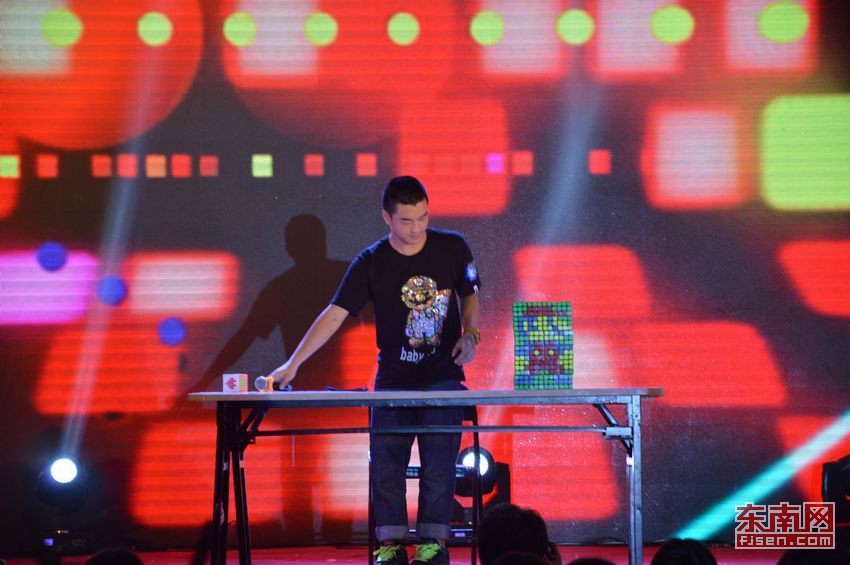 紧接着,来自土木学院的林铮带来的魔方表演更是令人瞠目结舌。林铮不仅单手挑战复原魔方,以迅雷不及掩耳的速度在两分九秒七九的时间内拧好六个三阶魔方,而且还蒙上眼睛拼出了超级玛丽形象。