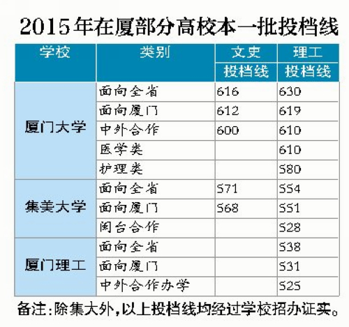 《厦门日报》、人民网、新华网、福建之窗、东南网、台海网、闽南网、中国网2015.7.16:文史类616分 理工类630分 厦大在闽本一批投档线出炉