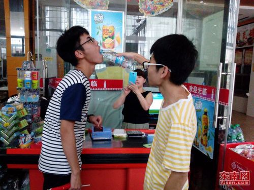 队员间互喂矿泉水。