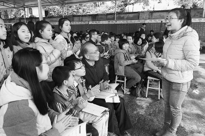 9日,由福州市仓山区台屿农家书屋陈松年等老人倡议并协办的“我从书山来”阅读交流活动在福州冯宅中心小学举行。活动得到了福州大学、福建师大、福建工程学院师生的响应,大学生们来到小学,和小学生们交流读书的快乐和收获。图为冯宅小学郑老师在畅谈读书的感受。