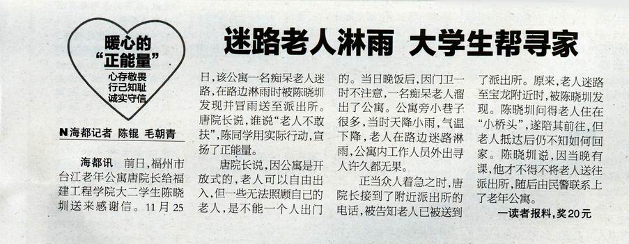 《海峡都市报》2015.12.12:迷路老人淋雨 大学生帮寻家