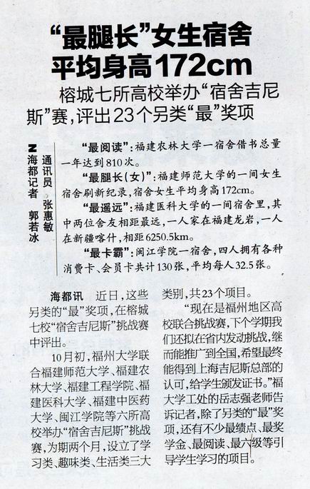 《海峡都市报》、东南网、腾讯、东快网、福州新闻网、福建之窗、新浪网、厦门网、人民网、台海网、中金在线2015.12.22:福州高校评出“最腿长”女生宿舍 平均身高172cm