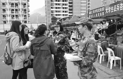 21日上午,福建省2016年住房城乡建设行业毕业生(人才)专场招聘会在福建工程学院北区足球场举行,在500个展位中,特别引人注目的是福州市晋安区人武部与福建工程学院共同设置的大学生征兵咨询展位,前来咨询的大学生络绎不绝。
