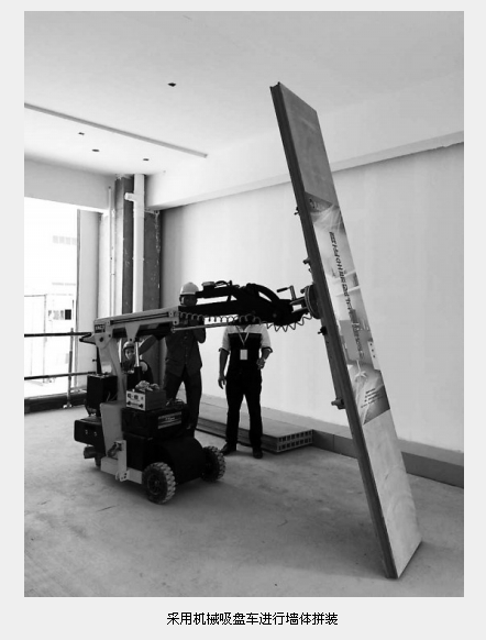 在工厂,现场技术人员利用机械吸盘车吸起墙板嵌入U型骨架,室内的一整面墙体随即快速安装完毕。