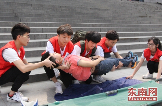 伤员转移到安全位置后,红十字会志愿者对其进行心肺复苏。