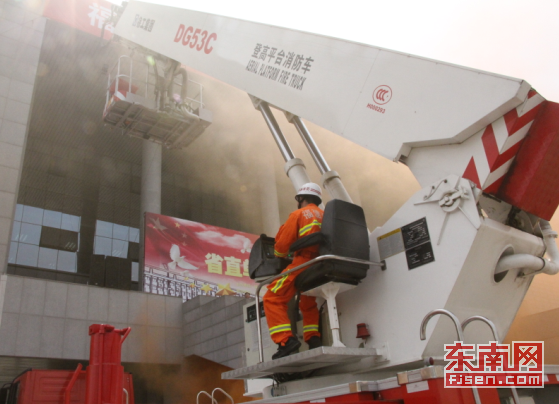 消防官兵通过52米登高平台消防车解救被困在图书馆3楼的师生。