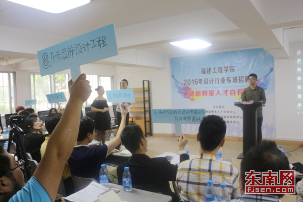 本次招聘会还在设计创新创客育成中心首次尝试特设“德新2016明星人才计划”专场活动。福州路美光电、福州东南装饰、福建省北辰广告等13家优秀企业代表担任评审团,13位设计学院优秀毕业生参加自荐环节,现场签约。