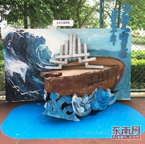 与此同时,创意海报立体联展也在火热进行中。土木学院的立体海报“乘风破浪”,是一幅手绘帆船作品。来自土木学院的曹沛斌表示:“设计这幅海报的理念是为了纪念学校120周年校庆,展现学校是建筑业的黄辅军校,机电工程师的摇篮。虽历经沧桑,但依旧乘风破浪。”