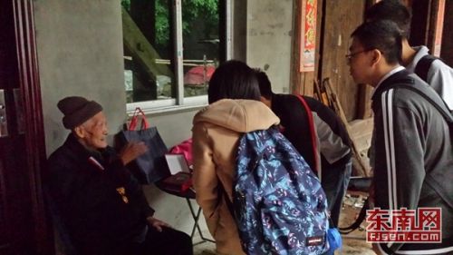 11月24日下午,福建师范大学文学院2014级基地团支部和福建工程学院土木工程学院青志委的同学们走进闽侯荆溪村光明小学,开展以“致敬英雄,传承薪火”为主题的团日立项活动。本次活动还探望了闽侯96岁抗战老兵陈道天,为他送上小学生们的绘画祝福和百只纸星星。