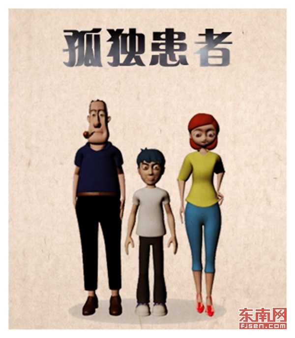 关于“孤独患者”,作者以玻璃瓶、高跟鞋、烟斗为原型设计了三个基本家庭角色——孩子、母亲、父亲。“通过三维动画短片的形式,我们想含蓄地告诉大家,作为父母不要一味地施加给孩子一切自认为是好的东西,要了解孩子真正需要的是什么。”作者介绍到。